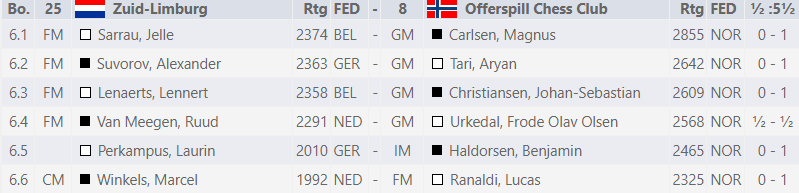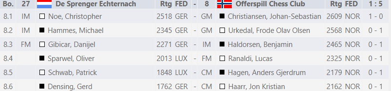 In round 4 we played yet another lower rated team. Magnus crushed on the first board, and we lost only one game by Benjamin (even though JS was in big trouble as well!).