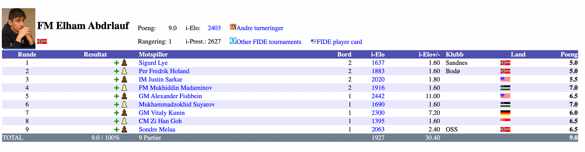 Etter 9 runders spill var det én spiller som virkelig utmerket seg. Sertifisert lynhai, FM Elham Abdrlauf, tok full pott med 9/9 poeng og en prestasjonsrating på hele 2627.